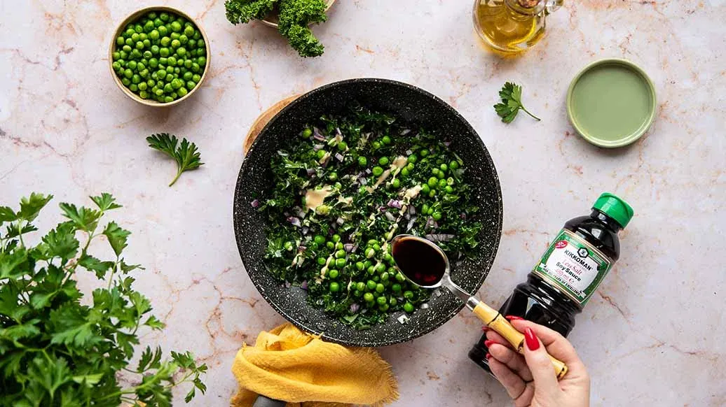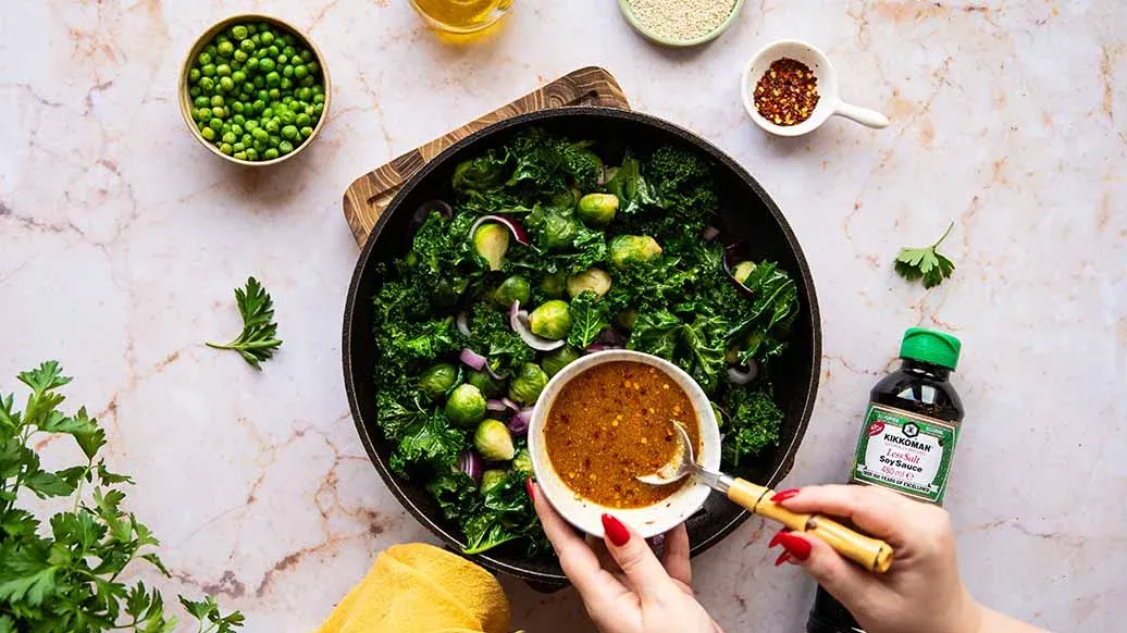Verwijder de taaie stelen van de boerenkool, halveer de spruitjes en snijd de ui in dikke plakken. Fruit de groenten 3 minuten in een pan met verhitte olijfolie. Meng in een kom de Kikkoman Sojasaus Minder Zout, tahini, water, honing en chilivlokken. Giet de saus in de pan en kook alles 8 minuten tot de saus reduceert en de groenten zacht worden. Bestrooi met de sesamzaadjes.