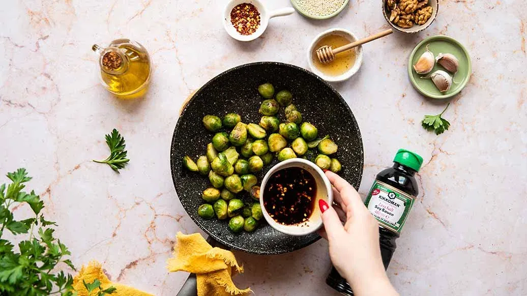Snijd de spruitjes doormidden. Verhit de olijfolie in een pan, voeg de spruitjes toe en bak ze 3 minuten. Voeg de Kikkoman Sojasaus Minder Zout, honing en Spaanse peper toe en bak nog eens 3 minuten.