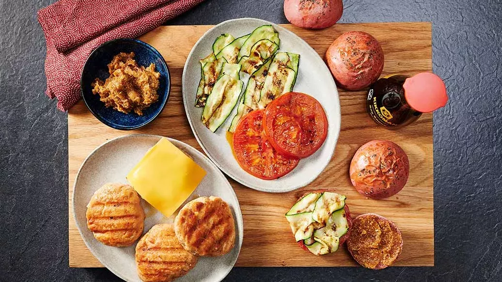 Voor de zalmburgers: dep de zalmfilet droog en doe deze in een blender met de citroenpeper en sojasaus. Vorm van het zalmmengsel 4 pasteitjes en zet ze in de koelkast tot u begint te barbecueën. Was en ontvel de vleestomaat en snijd in 4 dikke plakken. Was de courgette, snijd de uiteinden eraf en snijd in de lengte in dunne plakjes.
