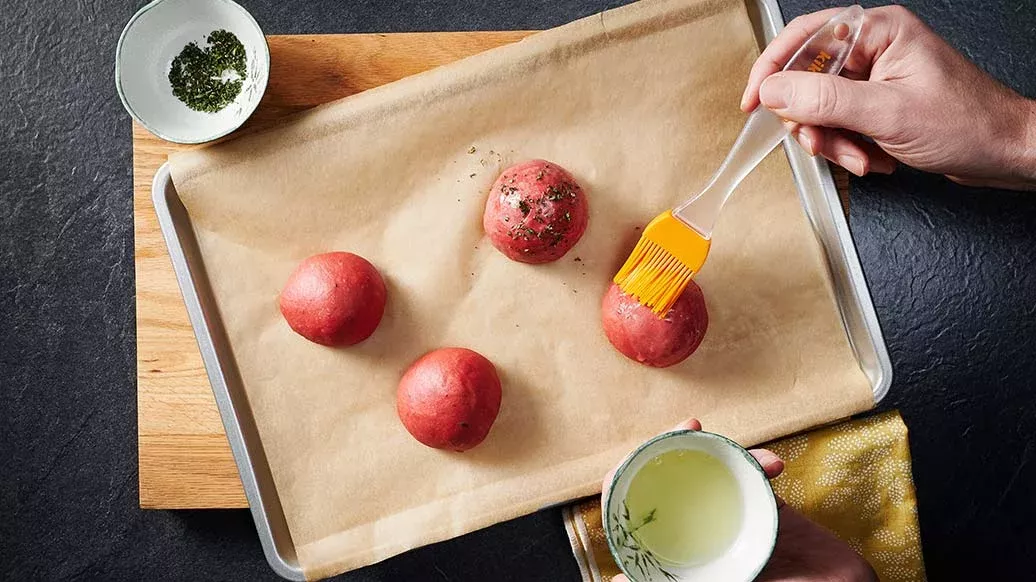 Bereid de burgerbroodjes door het sap (of ¼ tot ½ theelepel kurkuma in 100 ml water) op te warmen. Verkruimel de gist erdoor en roer om op te lossen. Scheid het ei Meng de gistoplossing, bloem, suiker, ½ theelepel zout, zacht geworden boter, een paar tijmblaadjes en het eigeel en kneed tot een zacht, glad deeg. Dek af en laat ongeveer 1 uur rijzen op een warme plaats.